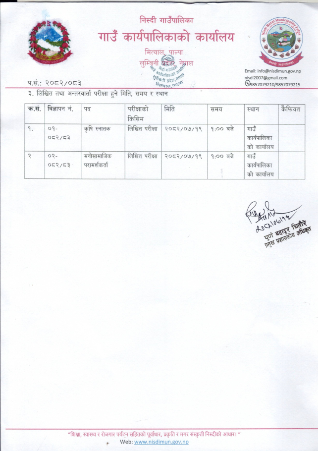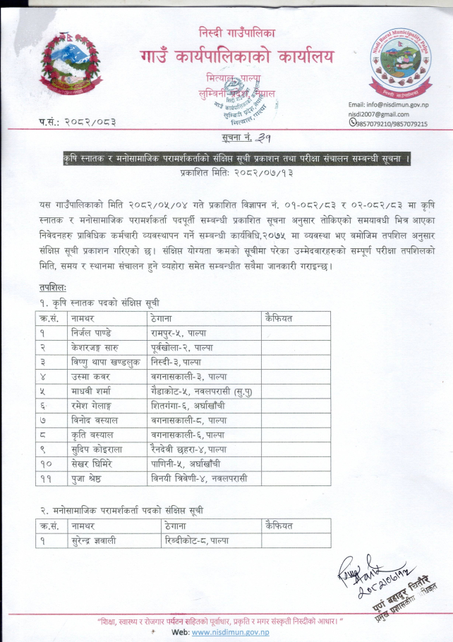 कृषि स्नातक र मनोसामाजिक परामर्शकर्ताको संक्षिप्त सूची प्रकाशन तथा लिखित परिक्षा संचालन सम्बन्धी सूचना ।