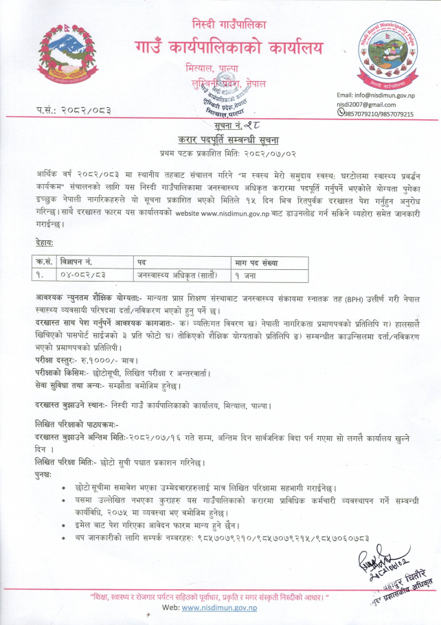 जनस्वास्थ्य अधिकृत (सातौ) पदका लागि पदपूर्ति सम्बन्धी सूचना ।