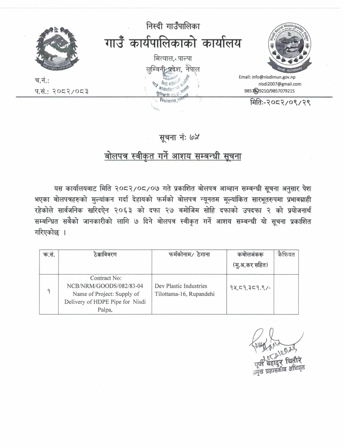 बोलपत्र स्वीकृत गर्ने आशय सम्बन्धी सूचना ।