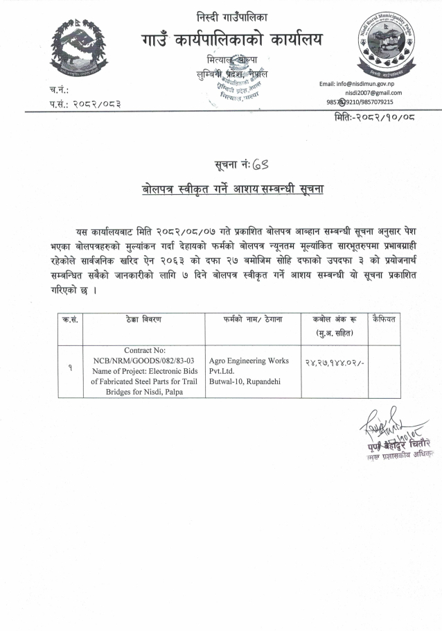 बोलपत्र स्वीकृत गर्ने आशय सम्बन्धी सूचना ।