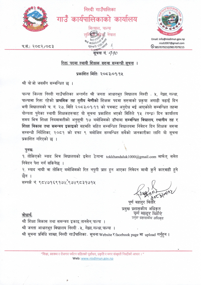 रिक्त पदमा स्थायी शिक्षक सरुवा सम्बन्धी सूचना ।