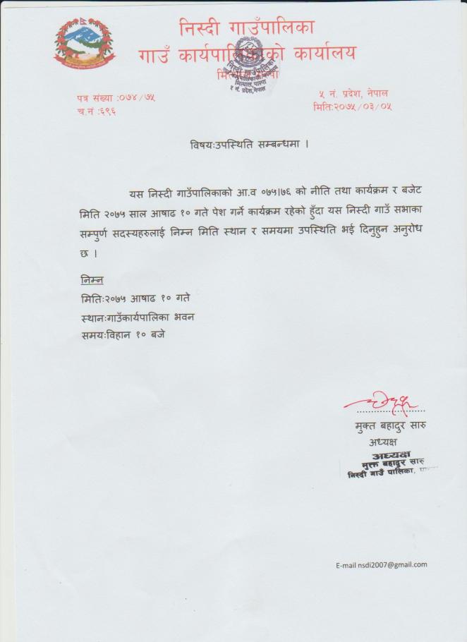 निस्दी गाउँपालिकाको मिति २०७४।११।२७ गते को विशेष गाउँ सभाबाट पारित योजना तथा बजेट विवरण
