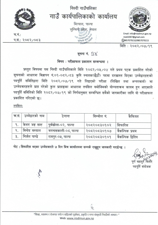 कृषि स्नातक पदको परीक्षाफल प्रकाशन सम्बन्धी सूचना ।