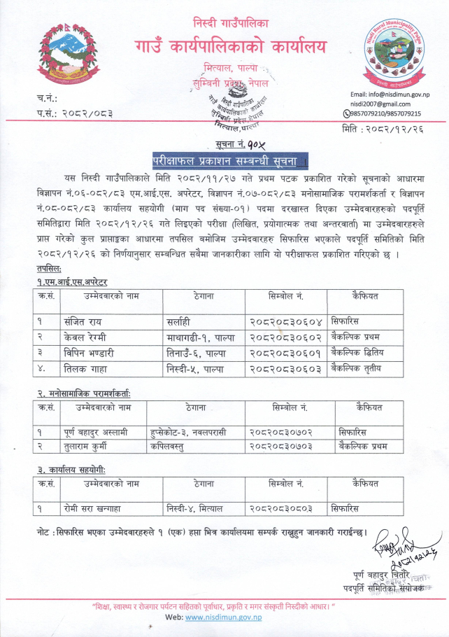 परीक्षाफल प्रकाशन सम्बन्धी सूचना ।
