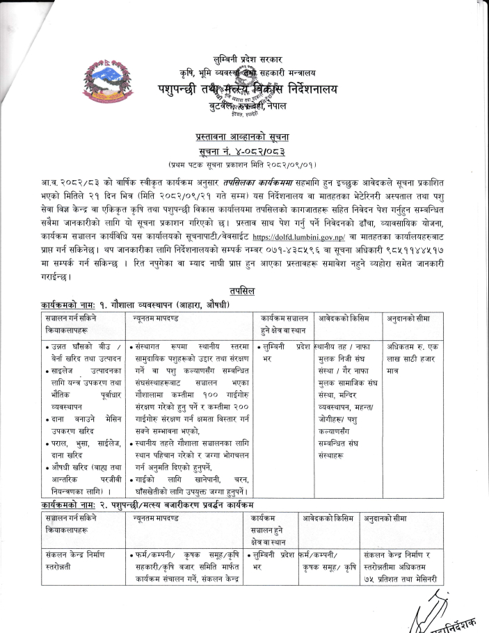 पशुपन्छी तथा मत्स्य विकास निर्देशनालय बुटवल रुपन्देहीको प्रस्तावना आव्हानको सम्बन्धी सूचना ।