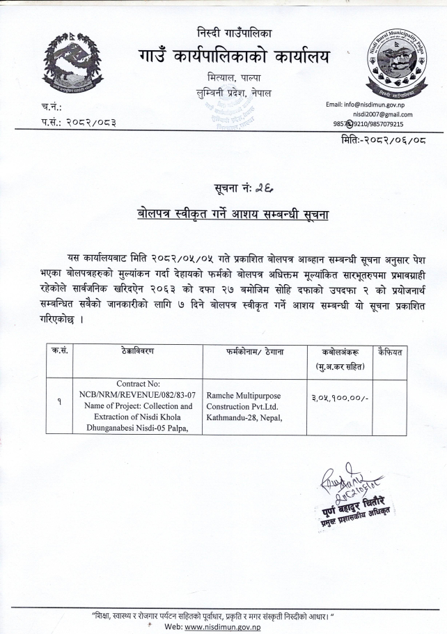 बोलपत्र स्वीकृत गर्ने आशय सम्बन्धी सूचना ।