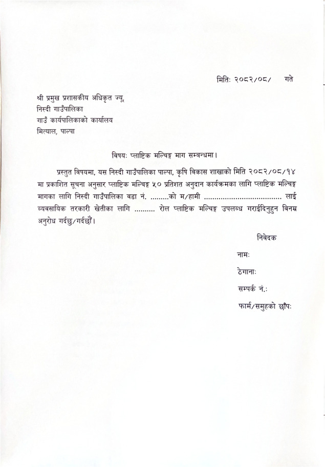 प्लाष्टिक मल्चिङ्ग ५० प्रतिशत अनुदान कार्यक्रम सन्चालनको लागि प्लाष्टिक मल्चिङ्ग माग सम्बन्धी सूचना ।