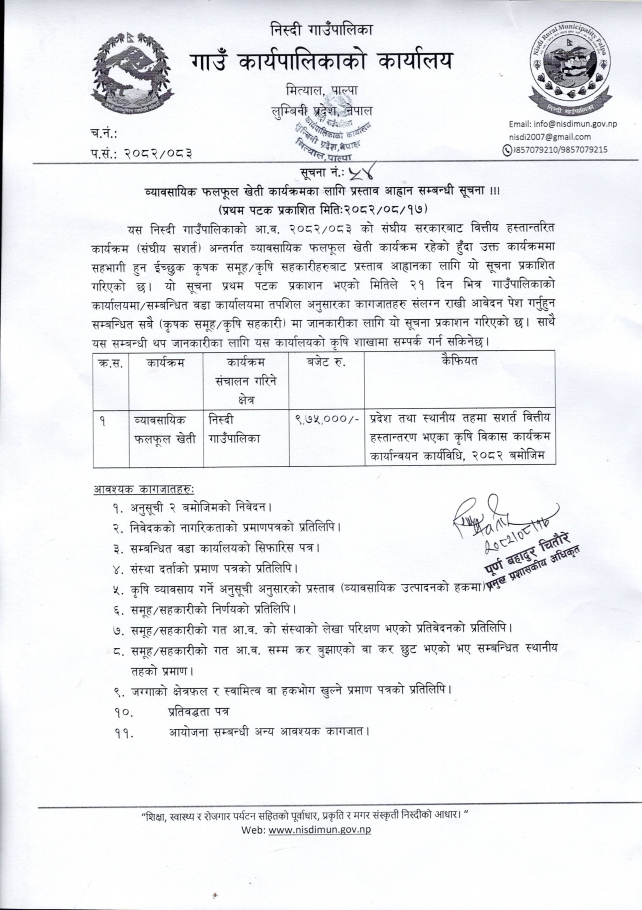 व्यावसायिक फलफूल खेती कार्यक्रमका लागि प्रस्ताव आव्हान सम्बन्धी सूचना ।